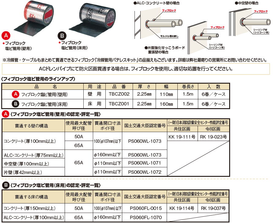 A.必要です。 図を参照の上、適切な「フィブロック 塩ビ管用」を使用してください。 冷媒管・ケーブルとまとめて貫通できる「冷媒管用パテレスキット」もございます。 詳しくは「ACドレンパイプ・継手カタログ」をこちらからダウンロードし、ご参照下さい。