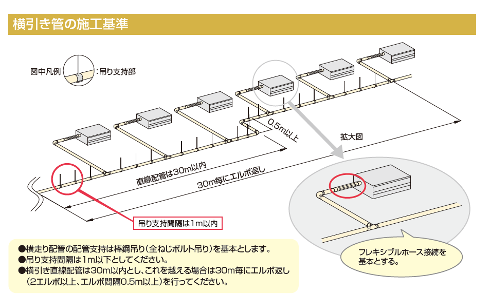 A.図のように、横引き管の吊り支持間隔は1m以下としてください。 詳しくは「ACドレンパイプ・継手カタログ」をこちらからダウンロードし、ご参照下さい。